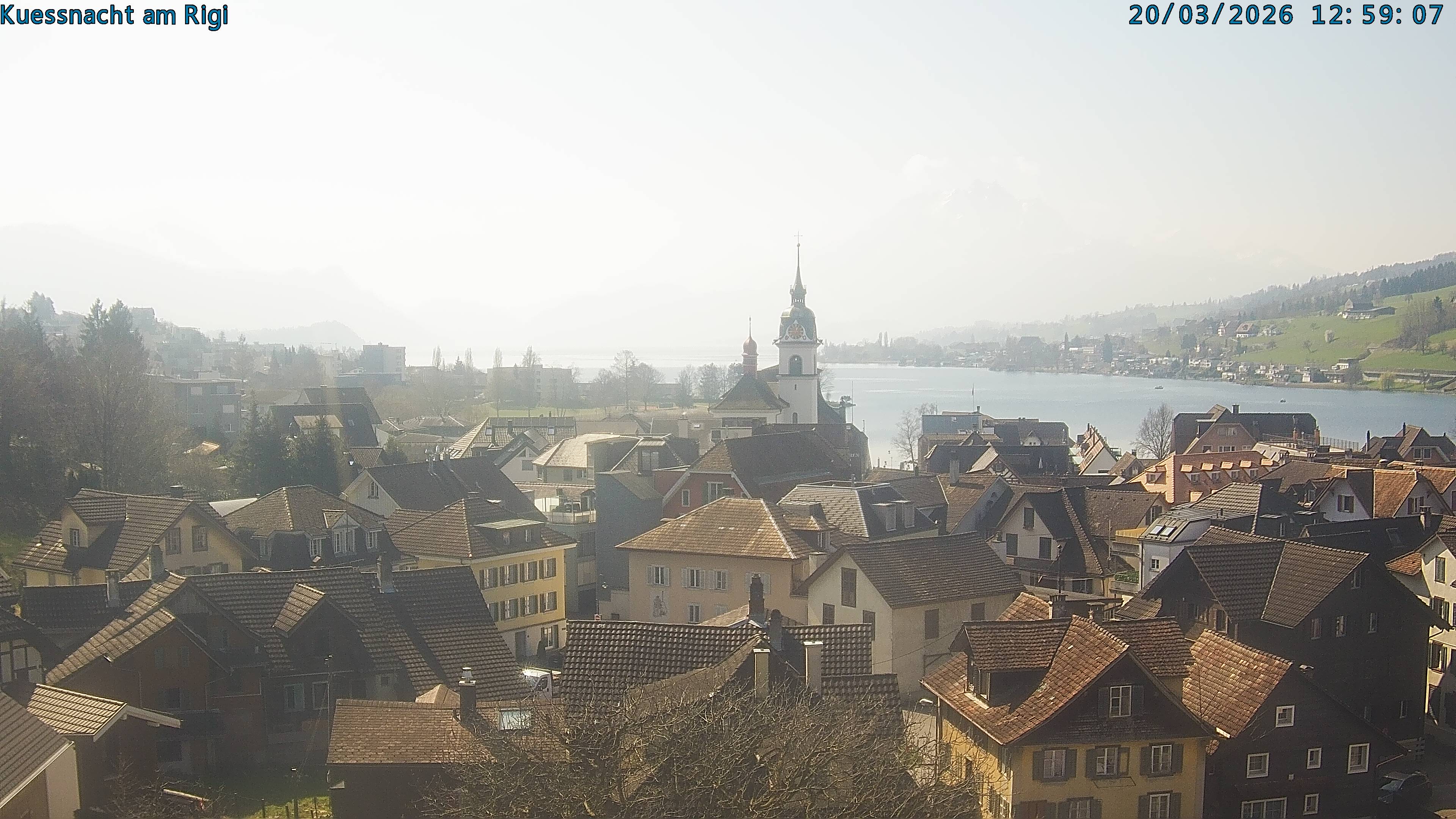 Horgen, Schweiz - 6.8 km von Neuheim: Nördicher Himmel über dem linken Zürichseeufer - Webcam der Gleitschirm-Flugschule Magiclift zeigt zum Bisenstartplatz in Oberrieden.