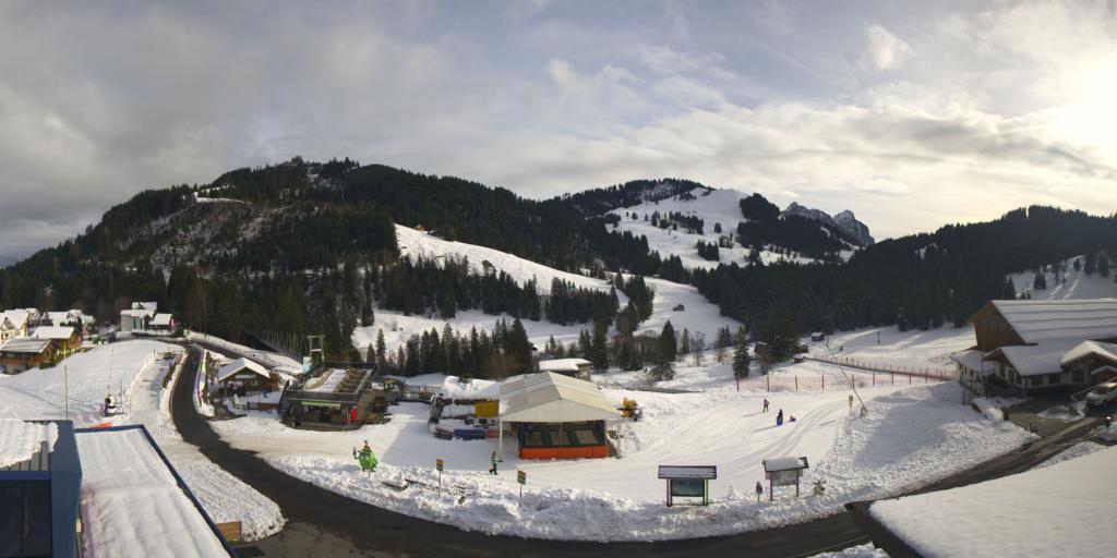 Horgen, Schweiz - 14.5 km von Pfaffikon: Nördicher Himmel über dem linken Zürichseeufer - Webcam der Gleitschirm-Flugschule Magiclift zeigt zum Bisenstartplatz in Oberrieden.