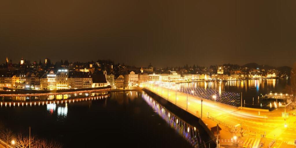 - Aussicht auf Kapellbrücke, Wasserturm, Altstadt, Museggmauer und Vierwaldstättersee.