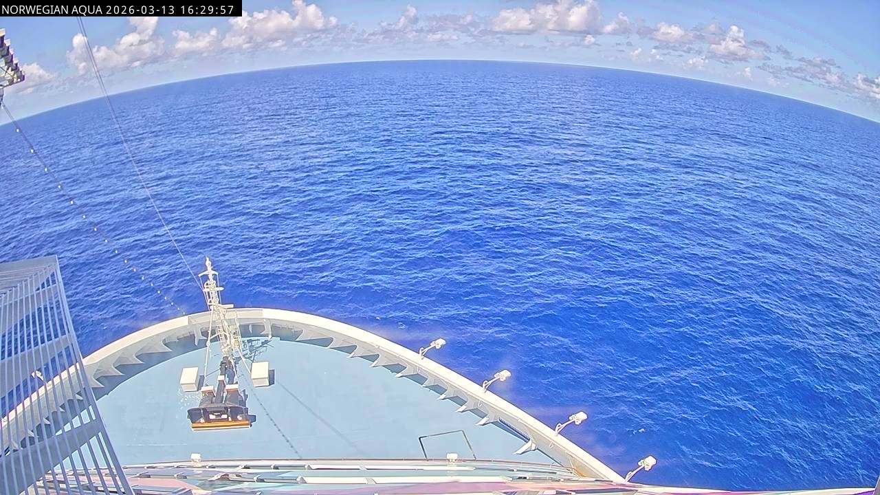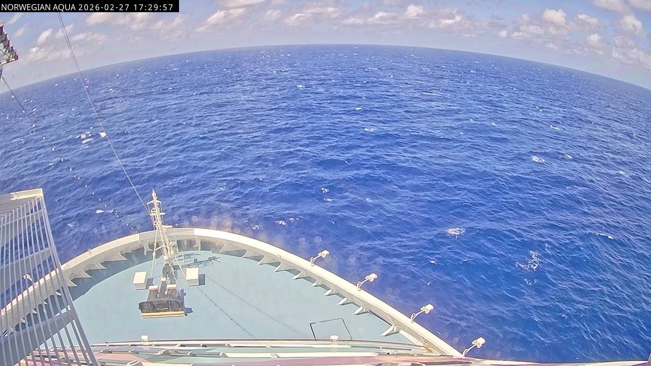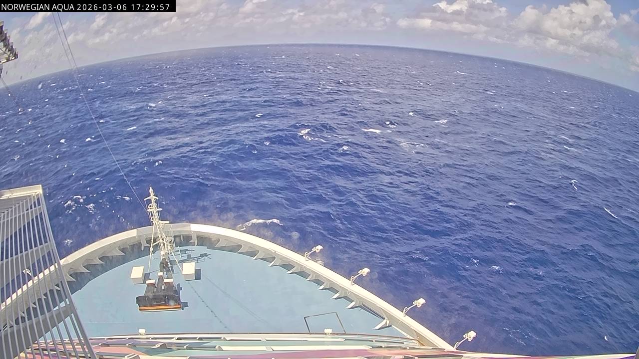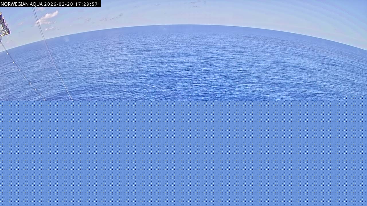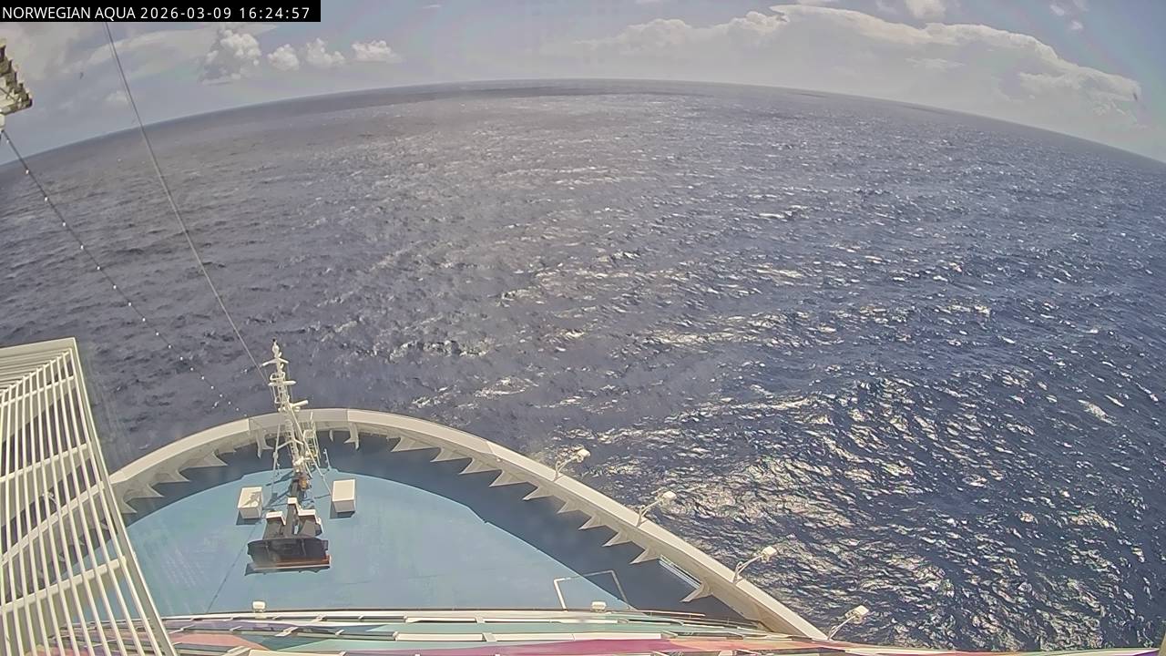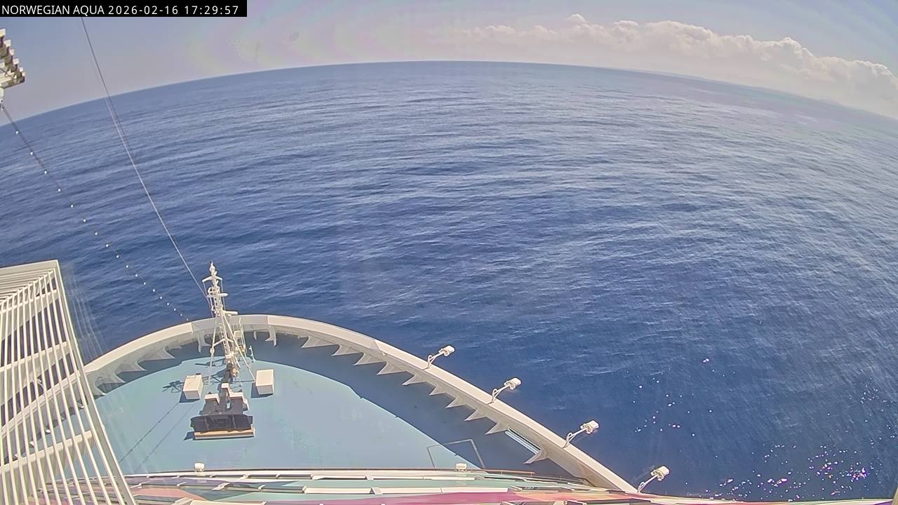 Norwegian Getaway, Norwegian Cruise Line - 126.3 km von Andros Town: Live auf See - Werfen Sie einen Blick von der Brücke des Kreuzfahrtschiffes Norwegian Getaway auf die See.