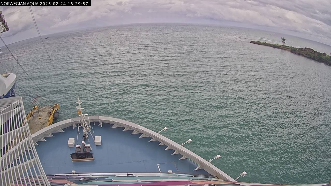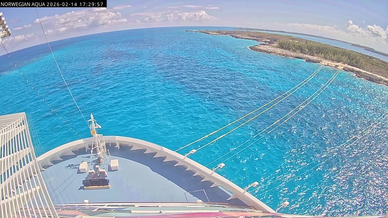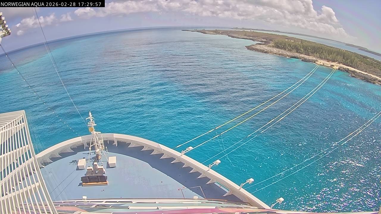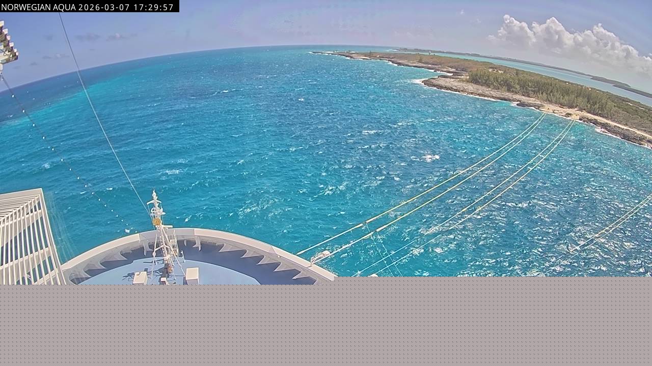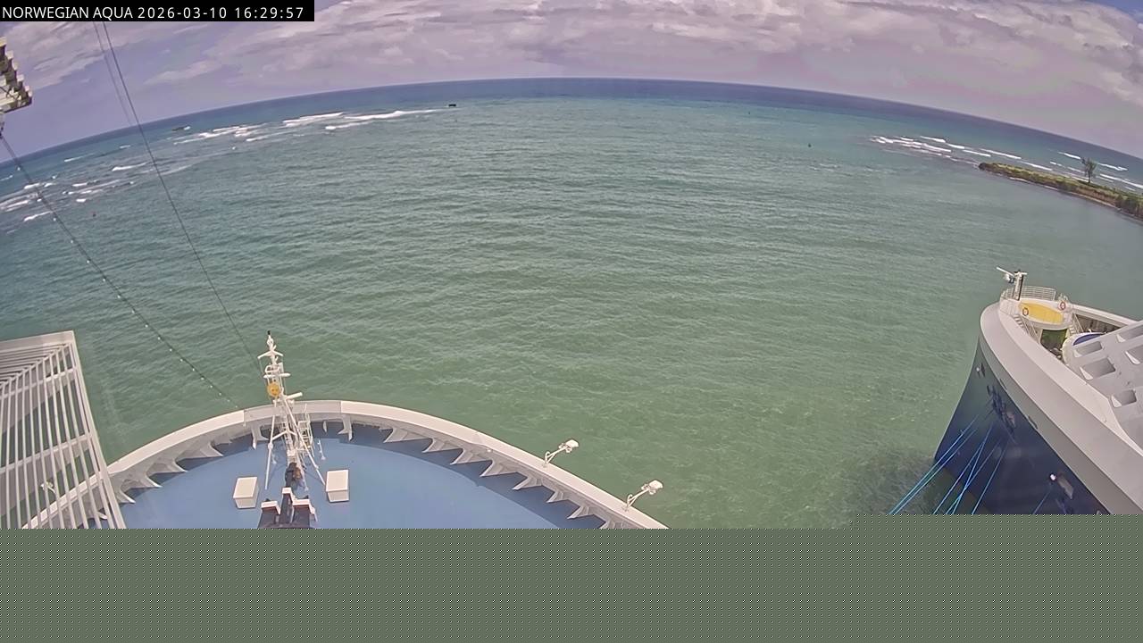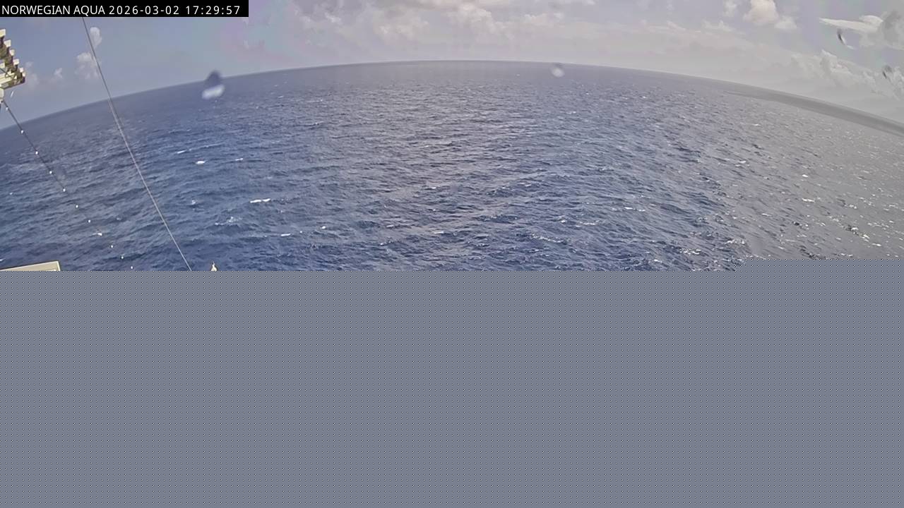 Norwegian Getaway, Norwegian Cruise Line - 126.3 km von Andros Town: Live auf See - Werfen Sie einen Blick von der Brücke des Kreuzfahrtschiffes Norwegian Getaway auf die See.