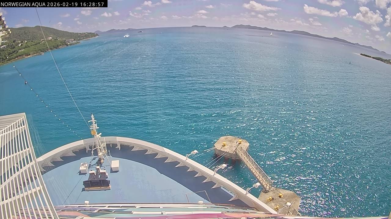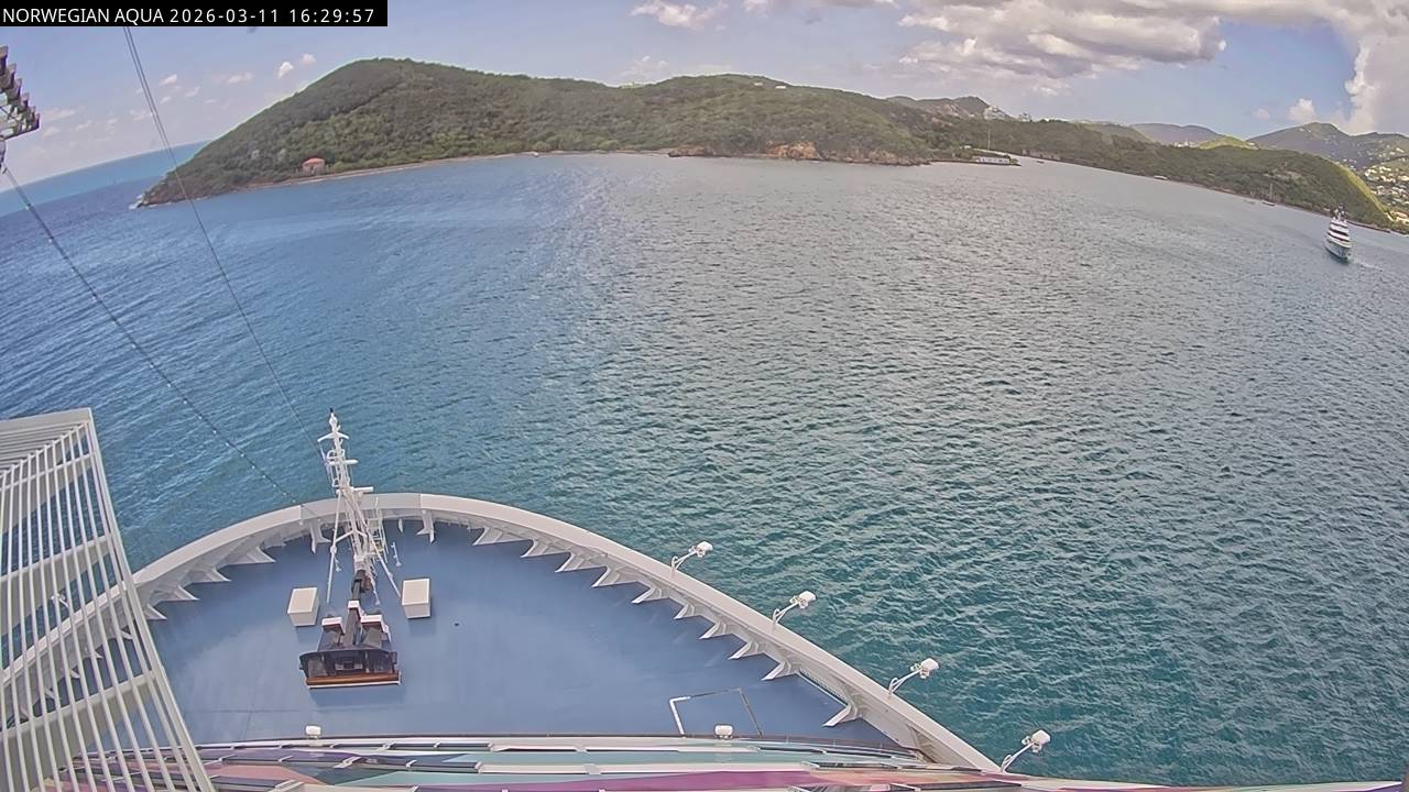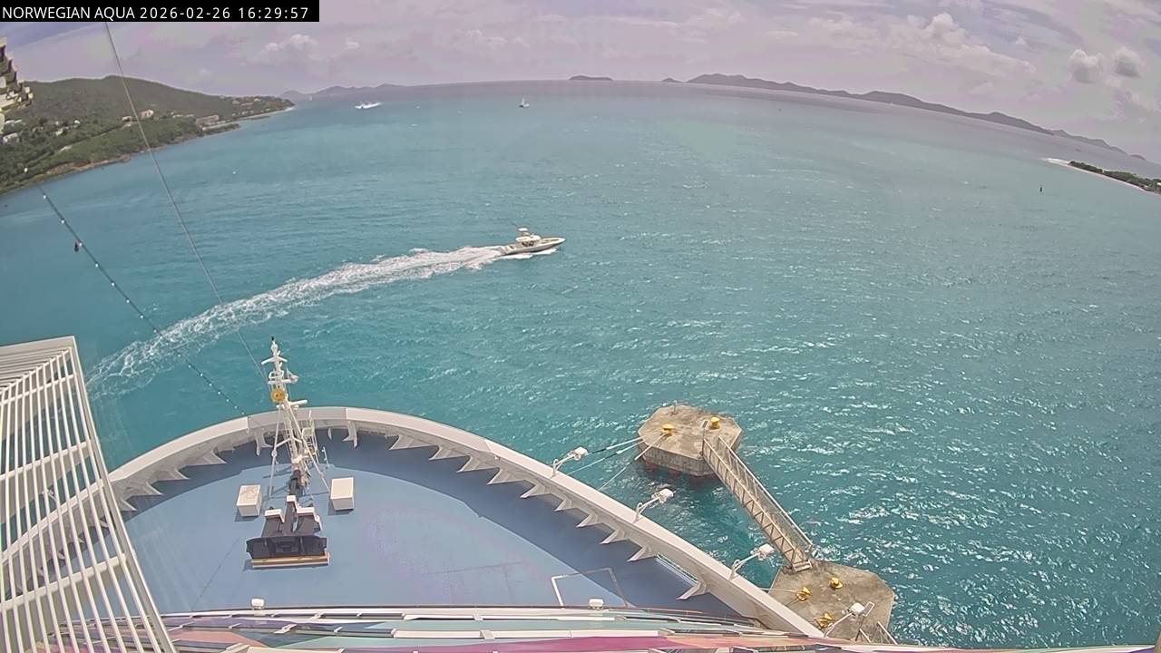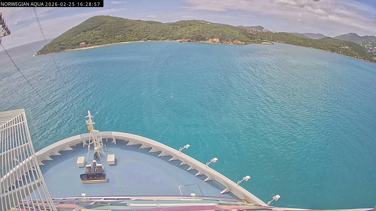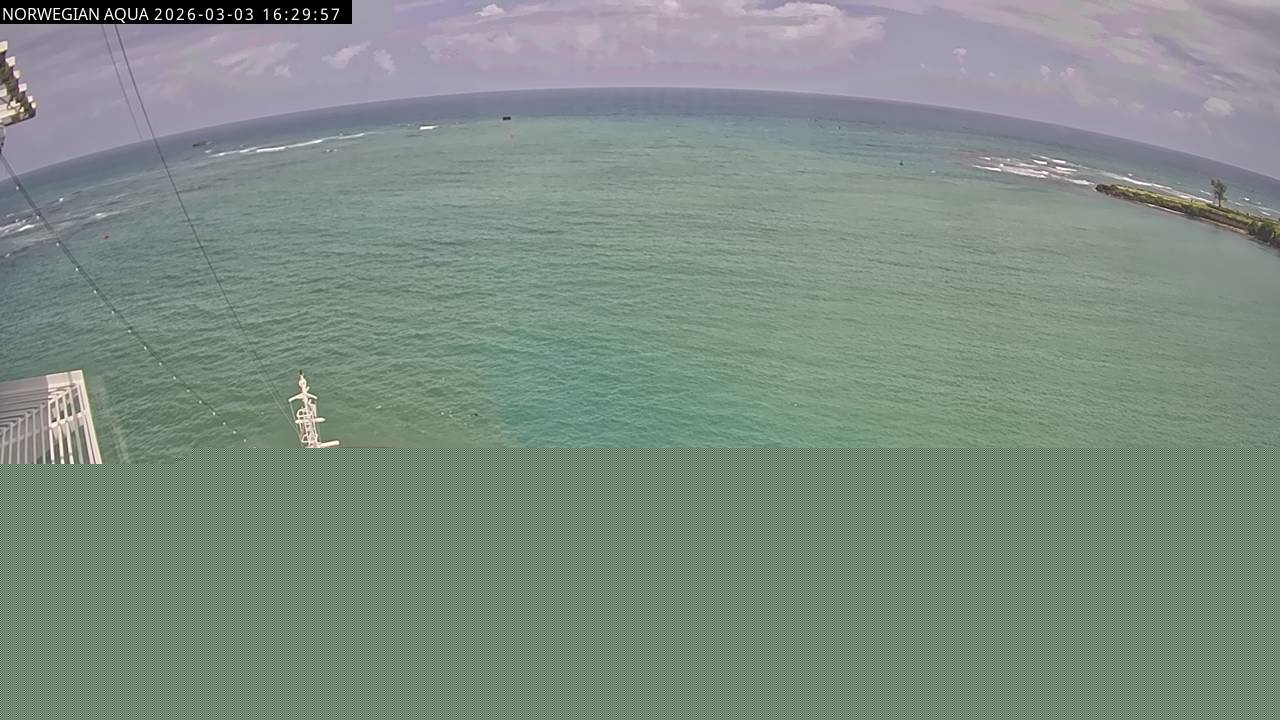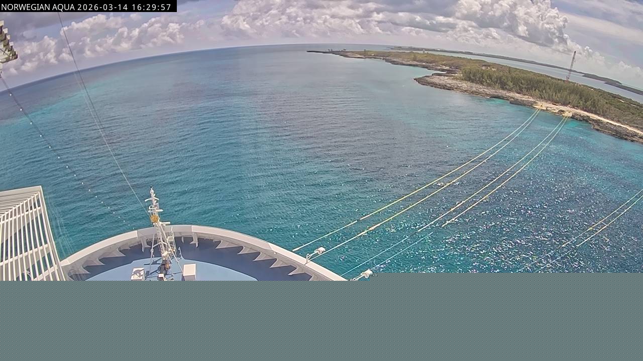 Norwegian Getaway, Norwegian Cruise Line - 126.3 km von Andros Town: Live auf See - Werfen Sie einen Blick von der Brücke des Kreuzfahrtschiffes Norwegian Getaway auf die See.