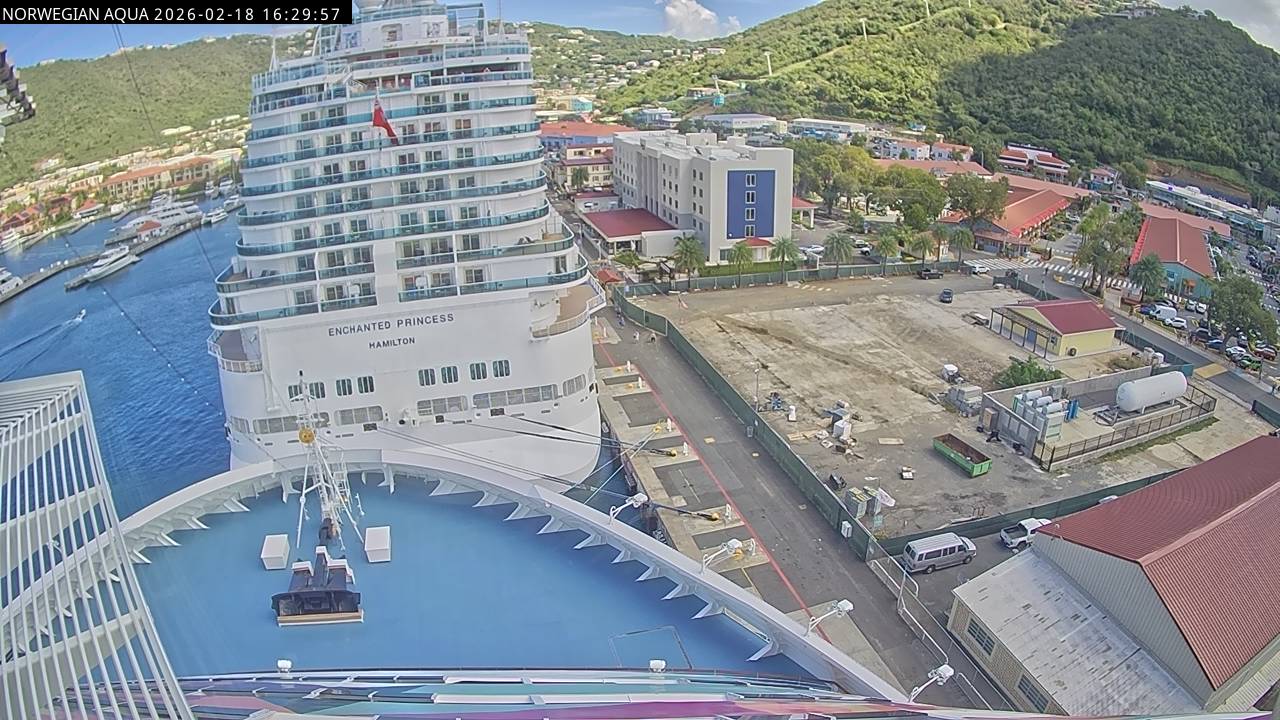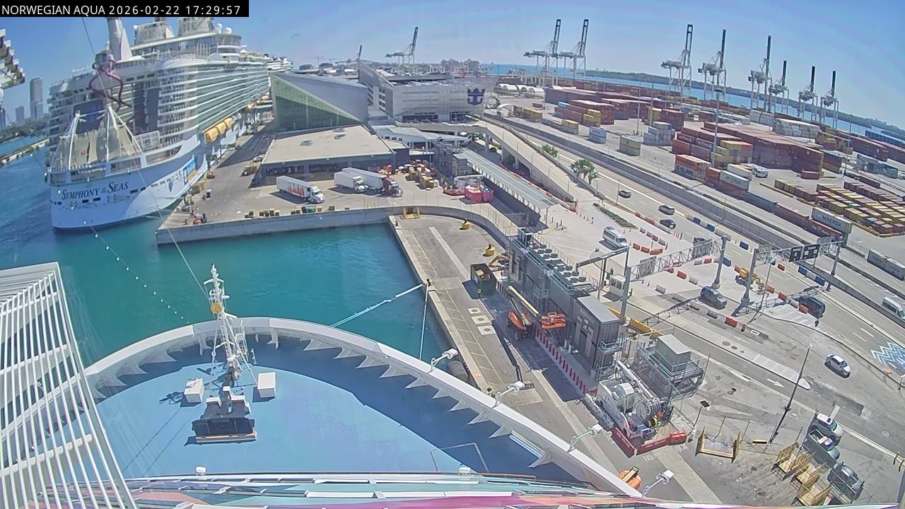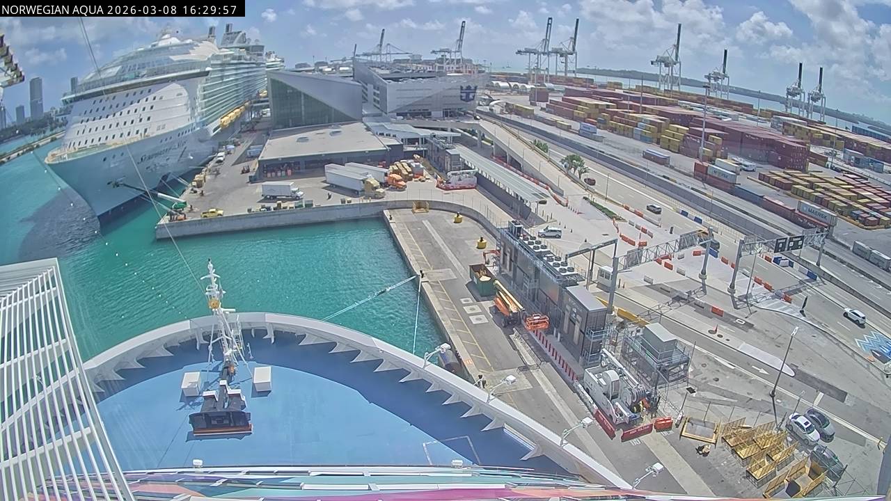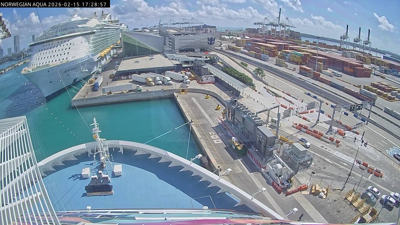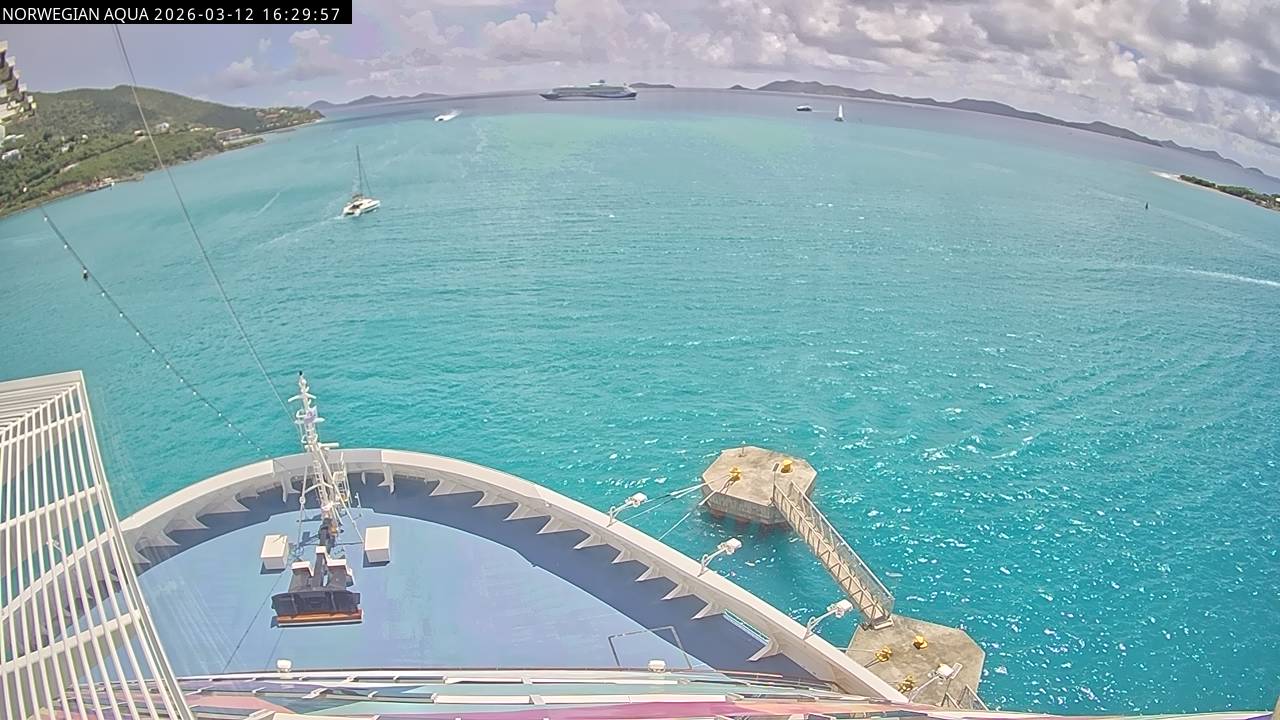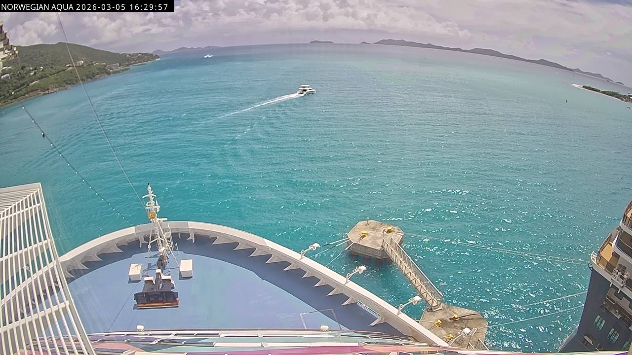 Norwegian Getaway, Norwegian Cruise Line - 126.3 km von Andros Town: Live auf See - Werfen Sie einen Blick von der Brücke des Kreuzfahrtschiffes Norwegian Getaway auf die See.