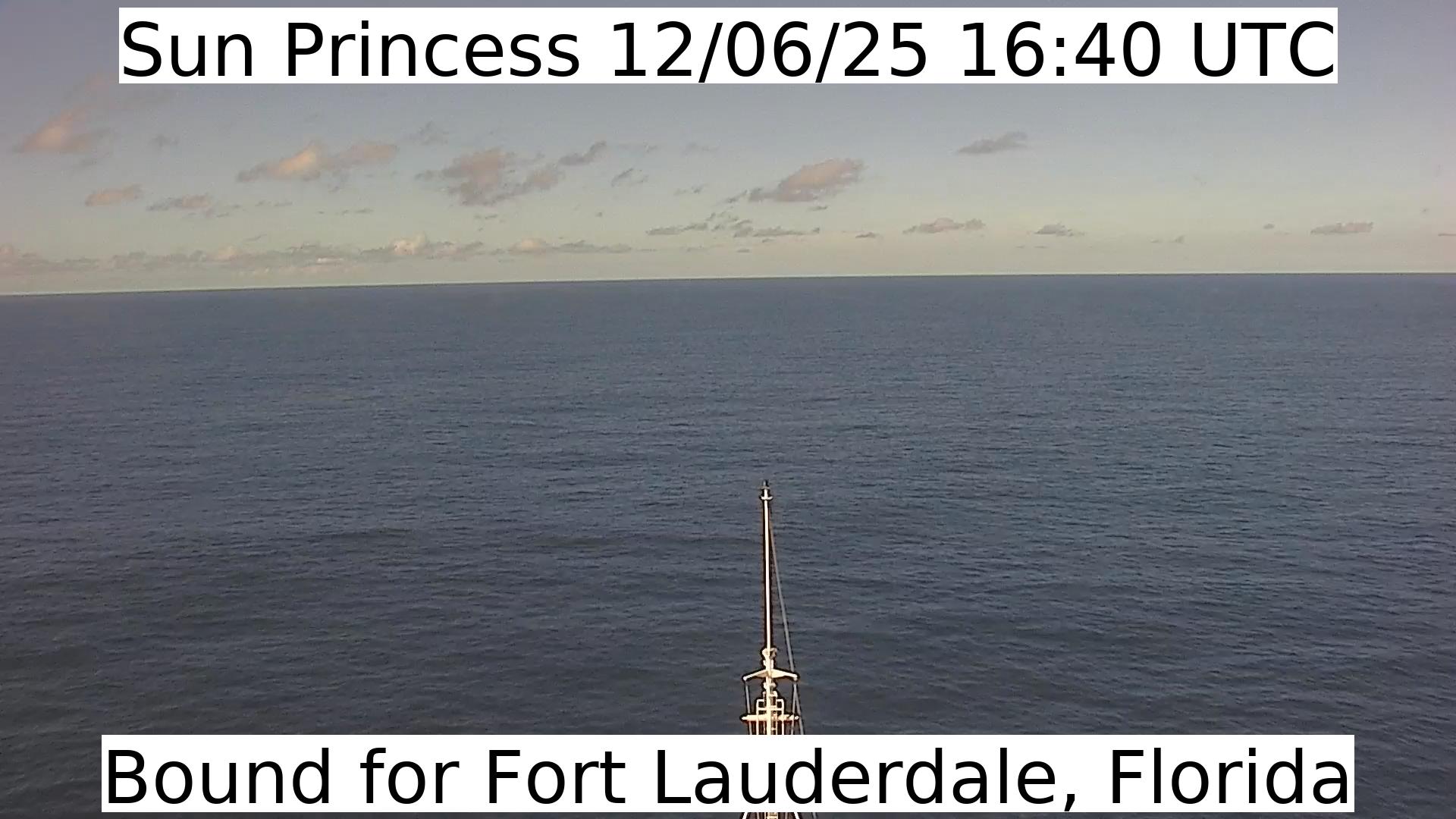 Norwegian Encore, Norwegian Cruise Line - 285.2 km von Coral Harbor: Live auf See - Werfen Sie einen Blick von der Brücke des Kreuzfahrtschiffes Norwegian Encore auf die See.
